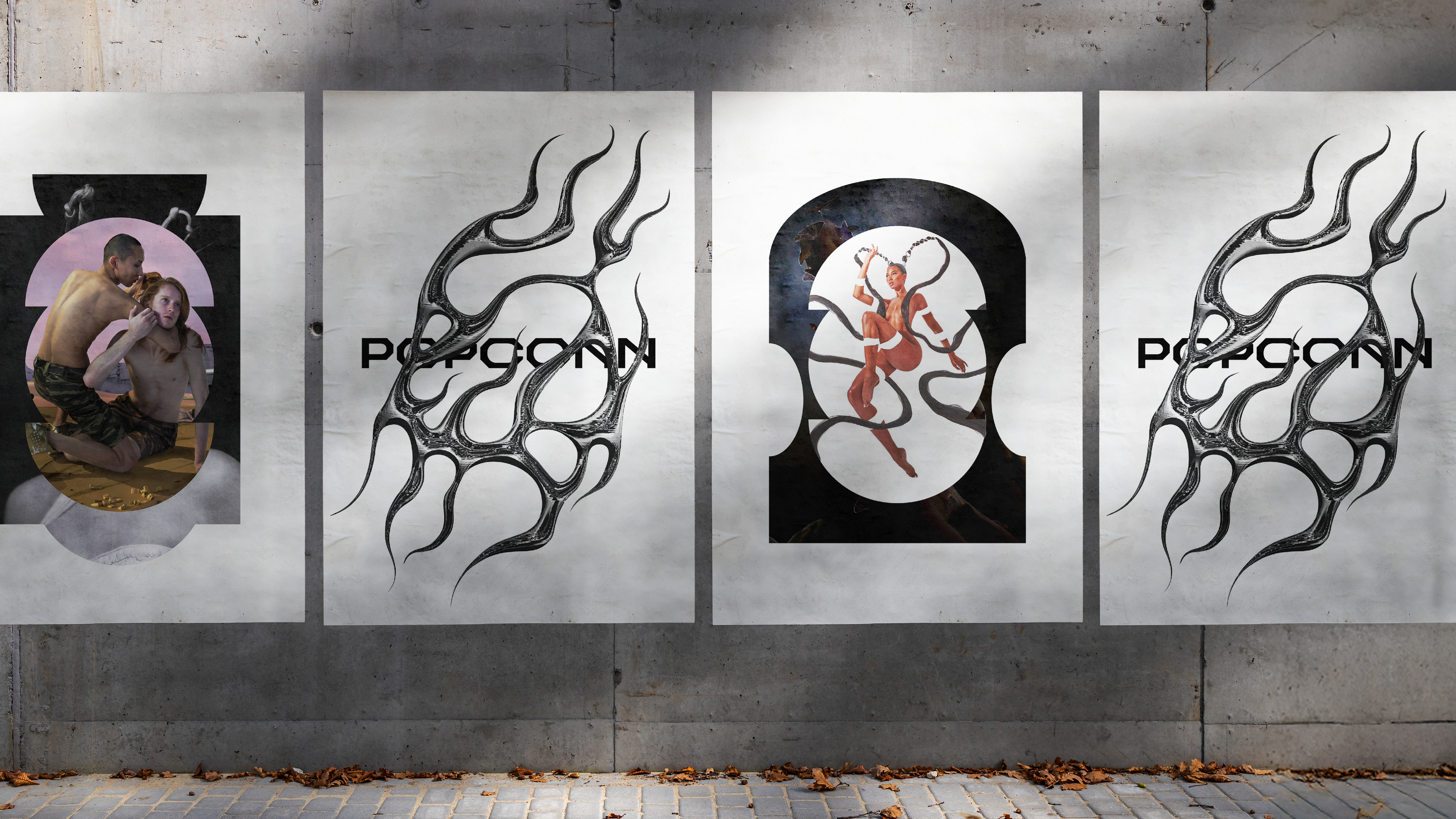 A set of ever evolving and unique forms have been created to frame artworks. This allows POPCONN to maintain a strong brand position that is never diluted or diminished by a contributor’s work. The forms can be massed and layered to create endless combinations that are instantly recognisable across the brand’s ecosystem – from digital to merchandise and built environments.